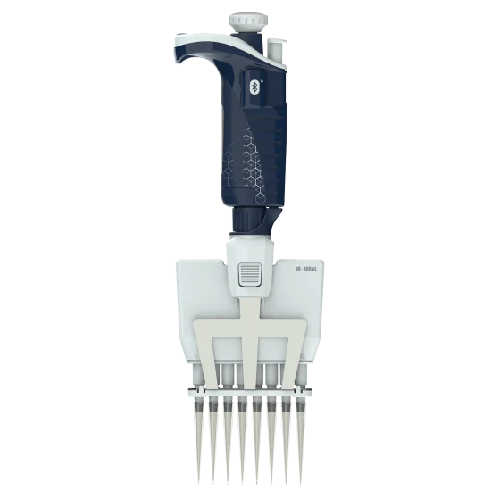 The PIPETMAN M P8x100M BT Connected is an electronic multichannel pipette designed for precise and efficient liquid handling. It features Bluetooth connectivity, allowing integration with systems like TRACKMAN to guide users through pipetting protocols and reduce human error. Its motorized piston ensures accurate aspiration and dispensing across all channels, making it ideal for high-throughput workflows such as PCR and ELISA.